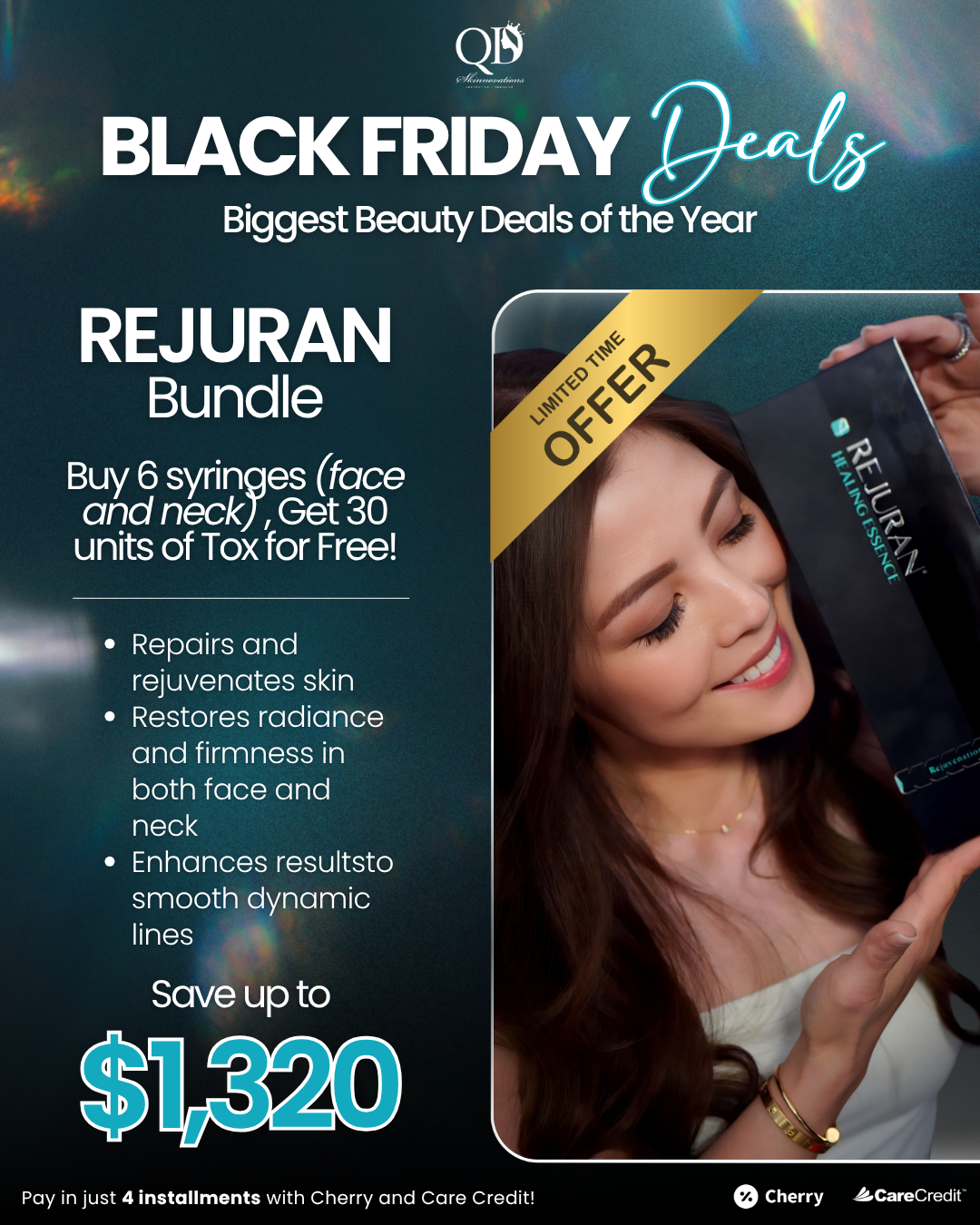 Revitalize dull, tired skin with Rejuran, the ultimate skin-healing booster that enhances elasticity and radiance. Buy 6 syringes and get 30 units of Tox free this Black Friday for complete face and neck renewal.
