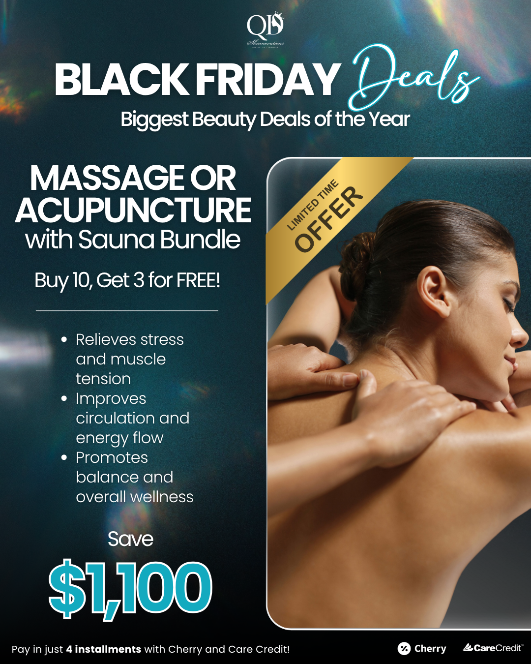 Relieve stress, restore balance, and boost circulation with our Massage or Acupuncture + Sauna Package. Buy 10 sessions and get 3 free — your body’s ultimate reset for wellness and relaxation this Black Friday.