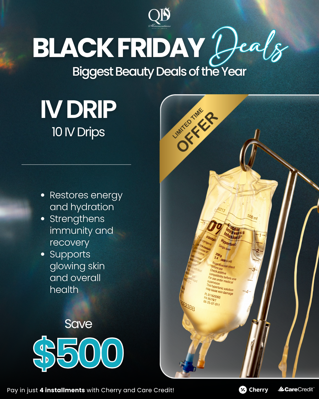 Boost your glow and immunity with our IV Drip Black Friday Offer. Enjoy 10 sessions designed to restore hydration, strengthen your body, and promote radiant, healthy skin — save up to $500 this season.